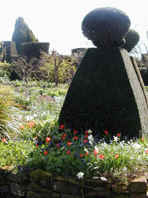The small shots of color stand out against the sculptural masses of yew topiary.
