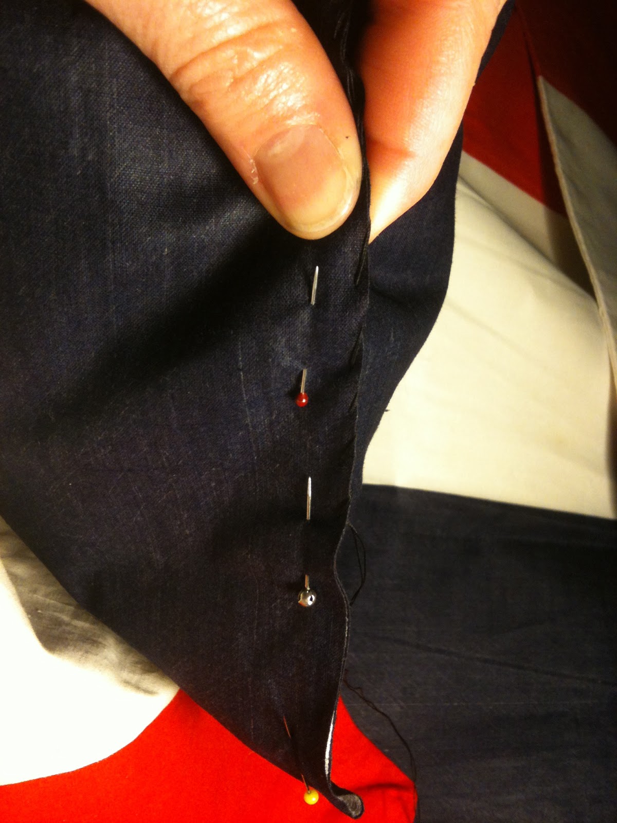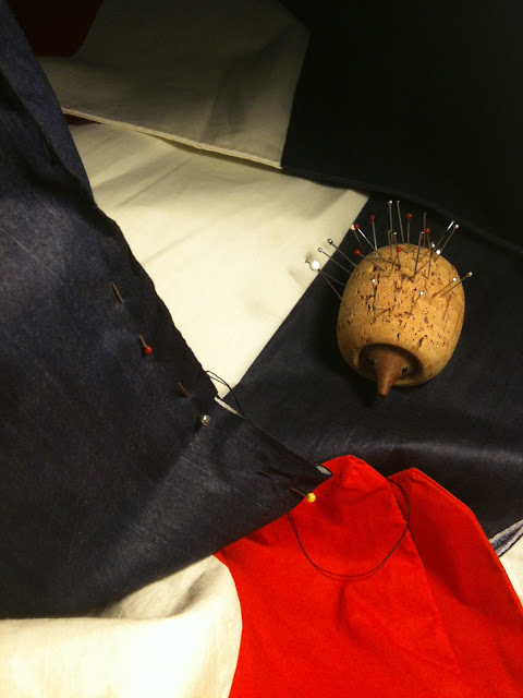 I stitches up this pile of French flags that were already closed on three sides so I just filled them with foam, pinned them closed, and hand stitched them up.