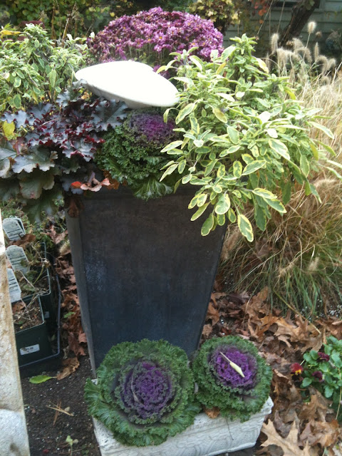 These tough plants are a boon to any fall landscape, and the ones I've planted here in New England show color well into January. Not only are they beautiful but they're edible too, and very good for you, in case you haven't heard. These I spied on the Upper East Side of Manhattan, two varieties nestled among the ivy in concrete planters.